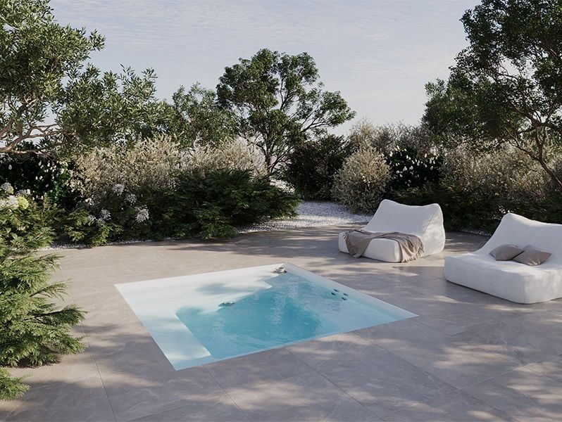 Spa à débordement deux places avec plusieurs possibilités d'assises.